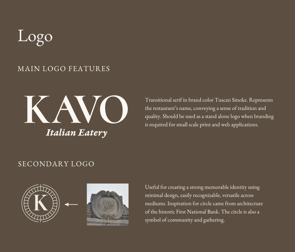 Typography & Logos – The serif fonts and clean secondary logo (inspired by the historic First National Bank building where Kavo is located) tie the past and present together.